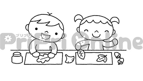 落ち葉とどんぐりの製作をする子どもたちのイラスト(白黒)