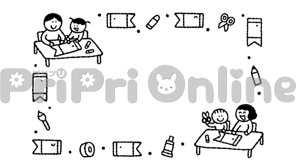 こいのぼりを作る子どもと保護者の飾り枠(白黒)