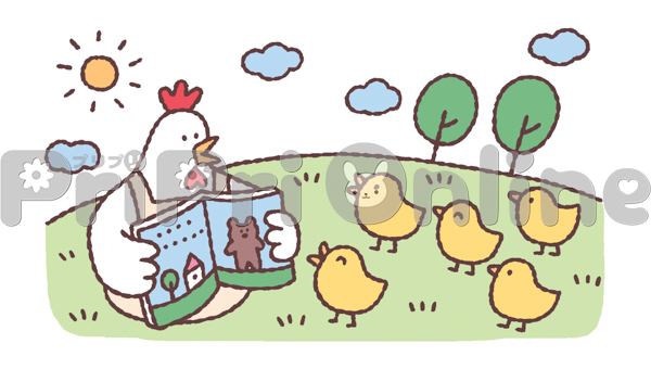 読み聞かせをするニワトリとヒヨコのイラスト
