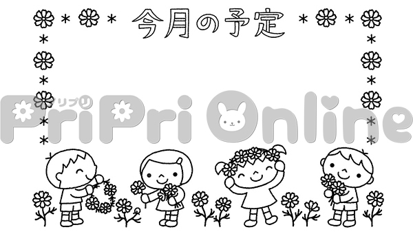 コスモスで遊ぶ子どもたちと「今月の予定」の飾り枠(白黒)