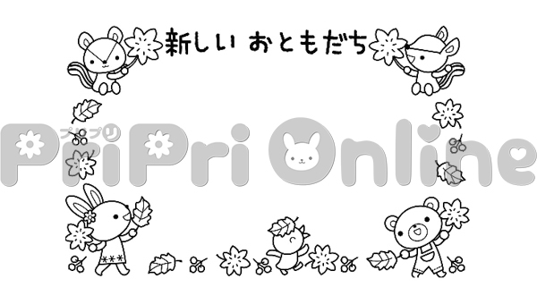 紅葉で遊ぶ動物たちと「新しいおともだち」の飾り枠(白黒)