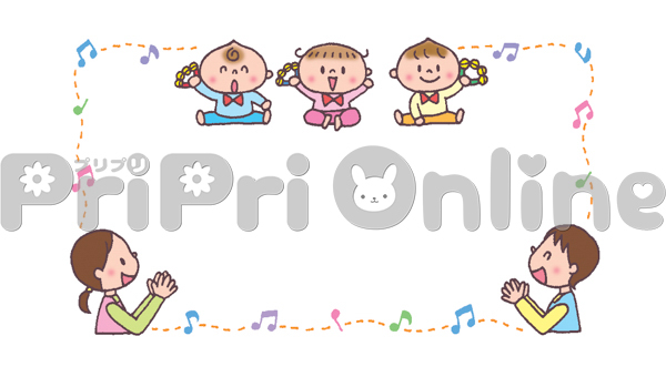 鈴を奏でる乳児たちと見守る保育者の飾り枠