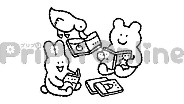 読書の秋に本を読む動物たちのイラスト(白黒)