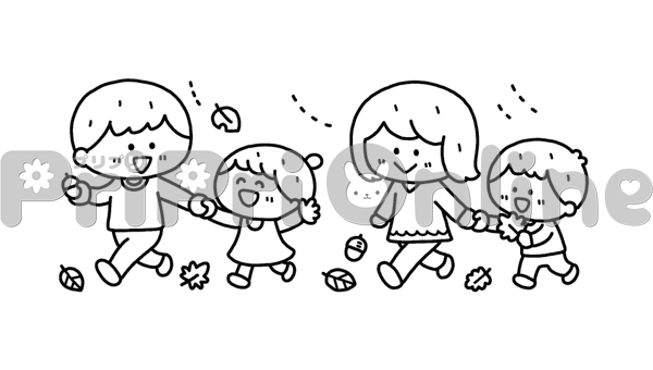 落ち葉と異年齢児交流する子どもたちのイラスト(白黒)