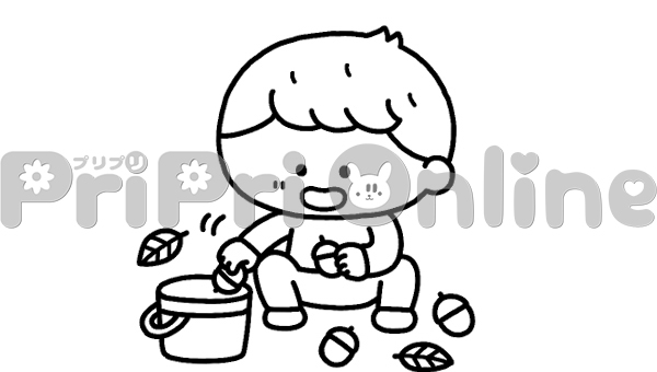 どんぐりを集める男の子のイラスト(白黒)