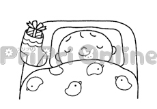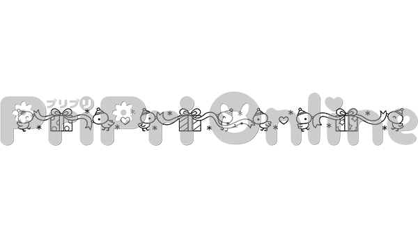 プレゼントを開ける小鳥たちの飾り罫(白黒)