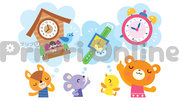 いろいろな時計を思い浮かべる動物たちのイラスト