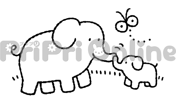 鼻でコミュニケーションをとるゾウの親子のイラスト(白黒)