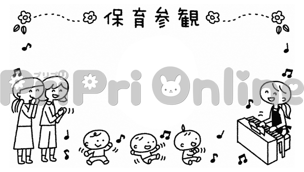 歌う子どもたちと「保育参観」の飾り枠(白黒)