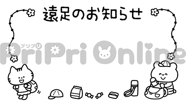 荷造りする動物たちと「遠足のお知らせ」の飾り枠(白黒)
