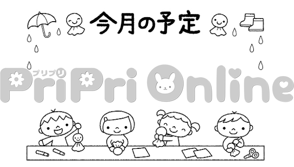 てるてる坊主を作る子どもたちと「今月の予定」の飾り枠(白黒)
