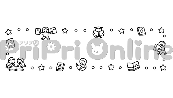 読書の秋に本を読む子どもたちの飾り枠(白黒)