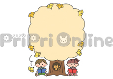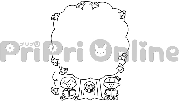 イチョウの木の下で読書する子どもたちの飾り枠(白黒)