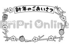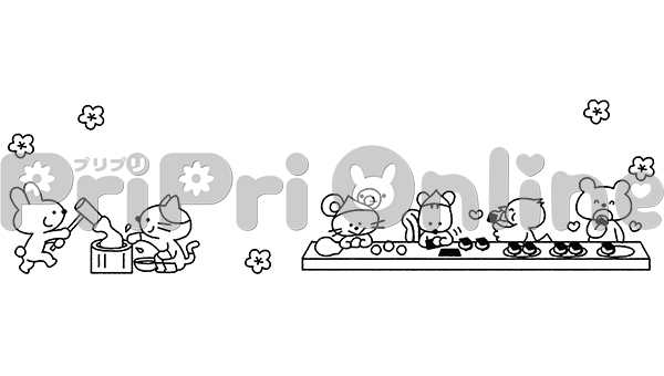 餅つきをする動物たちの飾り枠(白黒)