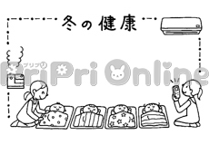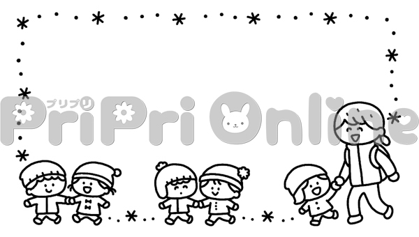冬に散歩する子どもたちと保育者の飾り枠(白黒)
