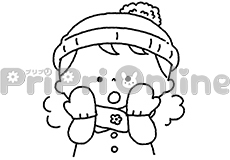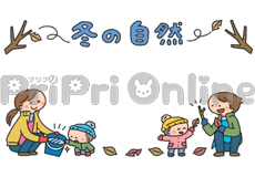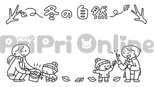 冬の外遊びの様子と「冬の自然」の飾り枠(白黒)