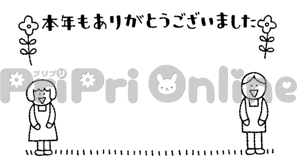 挨拶する保育者と「本年もありがとうございました」の飾り枠(白黒)