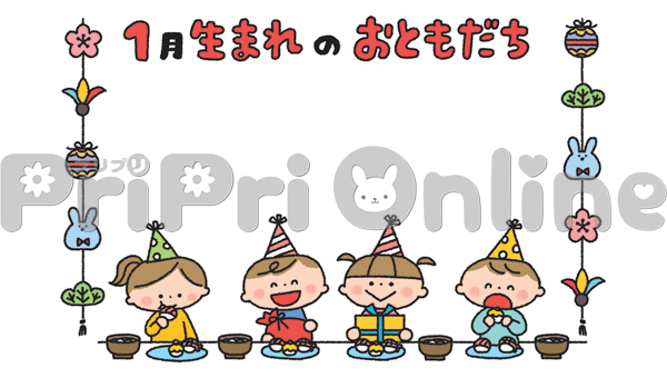 誕生日を祝う子どもたちと「1月生まれのおともだち」の飾り枠