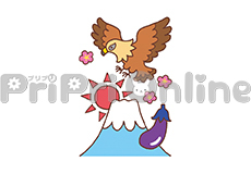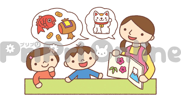 正月の縁起の良いものを子どもに説明する保育者のイラスト