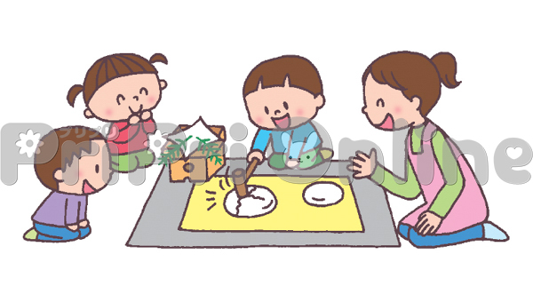 鏡開きをする子どもたちと保育者のイラスト