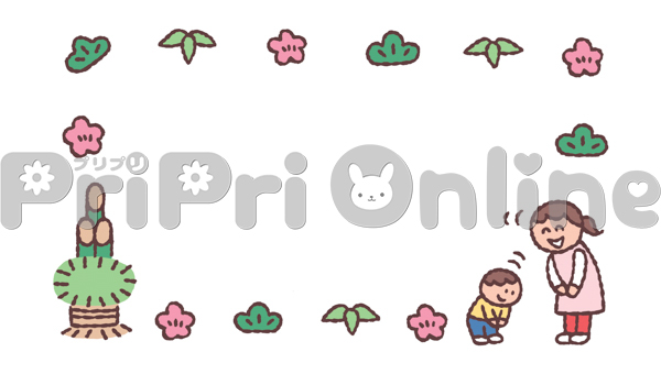 新年の挨拶をする子どもと保育者と松竹梅の飾り枠