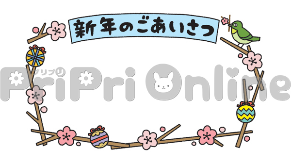 メジロや梅の花と「新年のごあいさつ」の飾り枠