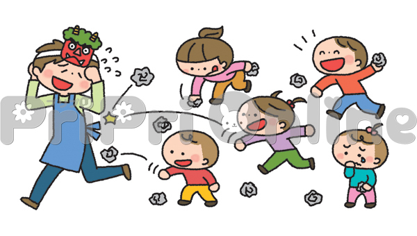 節分に鬼退治をする子どもたちと保育者のイラスト