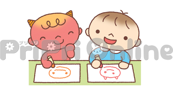 似顔絵を描き合う鬼と子どものイラスト