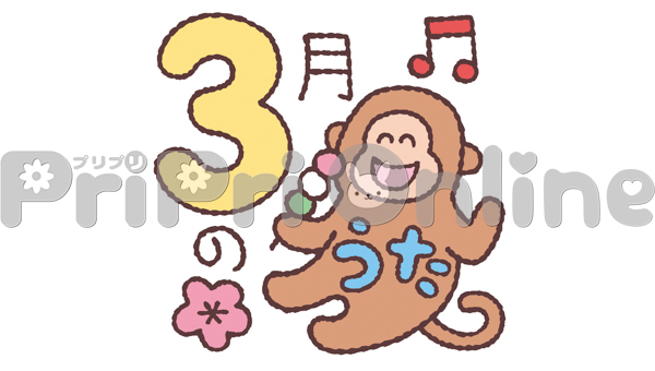 団子を食べるサルと「3月のうた」の飾り文字