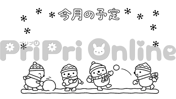 雪合戦する雪だるまと「今月の予定」の飾り枠(白黒)