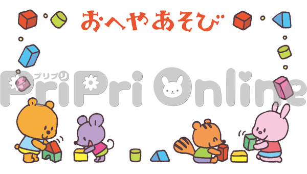 積み木で遊ぶ動物たちと「おへやあそび」の飾り枠