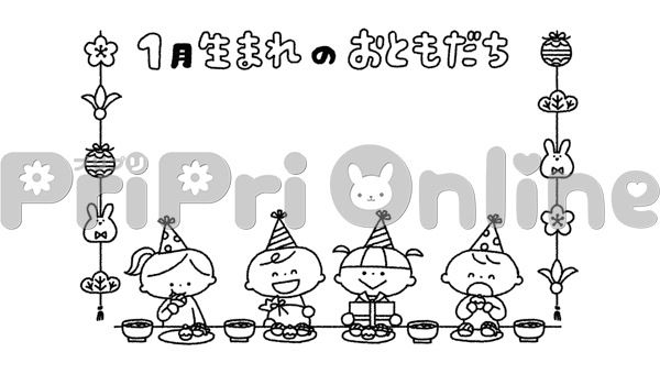 誕生日を祝う子どもたちと「1月生まれのおともだち」の飾り枠(白黒)