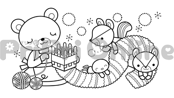 編み物をする動物たちのイラスト(白黒)