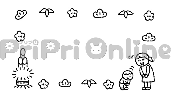 新年の挨拶をする子どもと保育者と松竹梅の飾り枠(白黒)