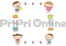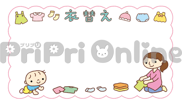 洗濯物をたたむ保護者と乳児の「衣替え」の飾り枠