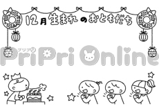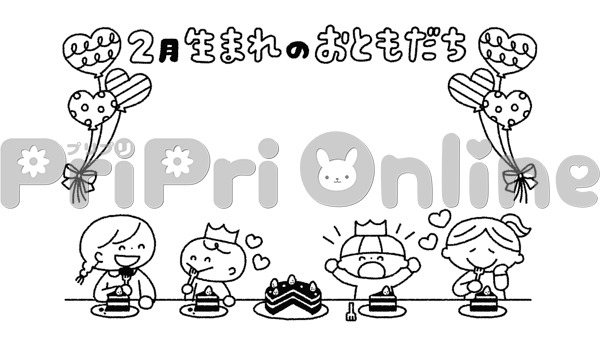 ケーキを食べる子どもたちと「2月生まれのおともだち」の飾り枠(白黒)