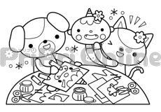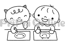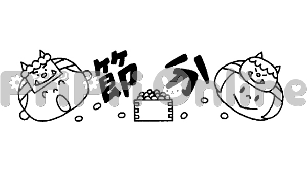 お面をつけた子どもたちと「節分」の飾り文字(白黒)