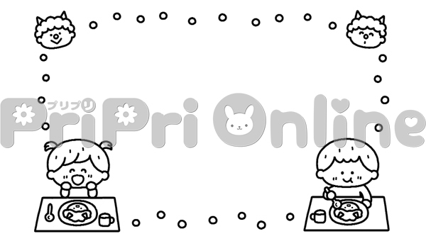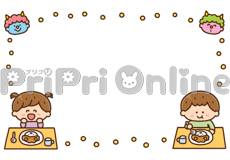 鬼のカレーを食べる子どもたちの飾り枠(白黒)