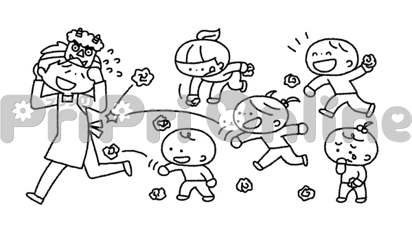 節分に鬼退治をする子どもたちと保育者のイラスト(白黒)