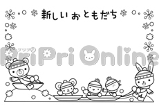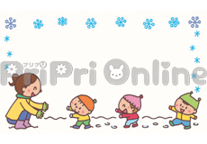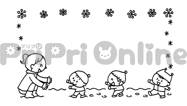 雪の上を歩く子どもたちと迎える保育者の飾り枠(白黒)