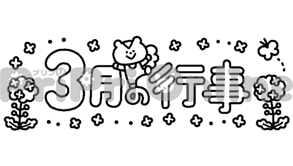 菜の花とリスと「3月の行事」の飾り文字(白黒)