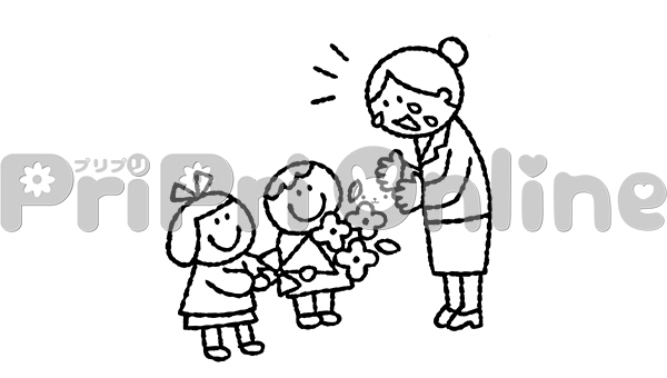 感謝の花束を渡す子どもたちと泣く保育者のイラスト(白黒)