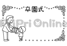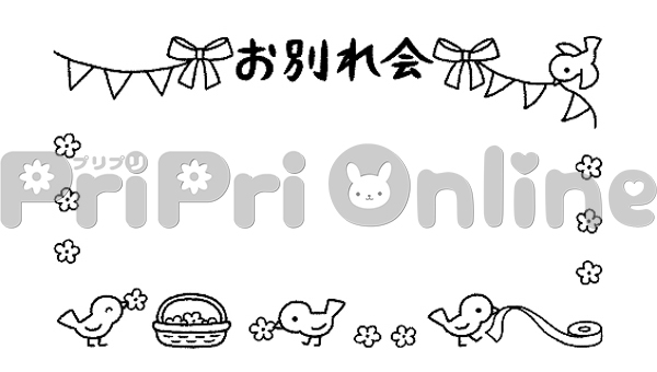 飾り付ける小鳥たちと「お別れ会」の飾り枠(白黒)