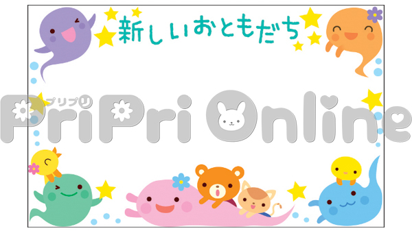 おばけと遊ぶ動物たちと「新しいおともだち」の飾り枠