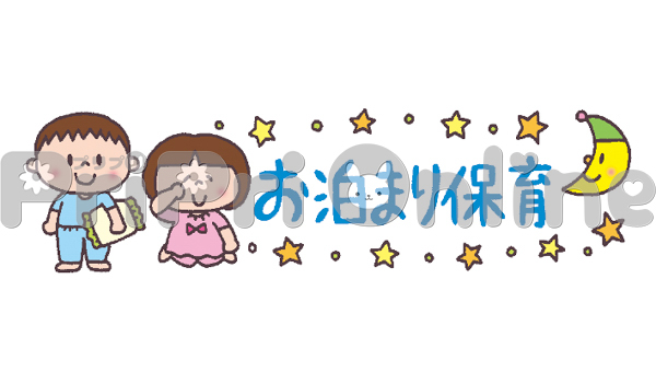 パジャマ姿の子どもたちと「お泊まり保育」の飾り文字