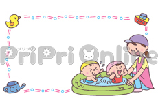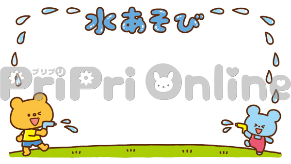 水鉄砲する動物たちと「水あそび」の飾り枠
