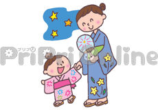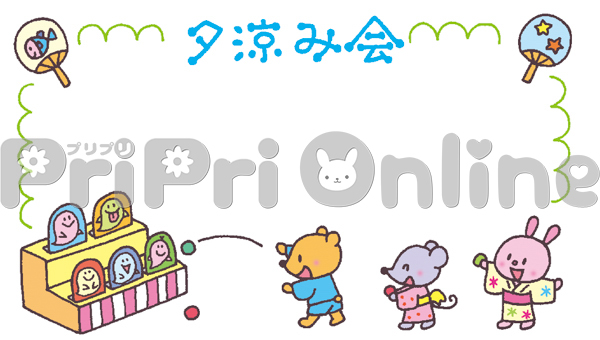 浴衣を着て屋台で遊ぶ動物たちと「夕涼み会」の飾り枠