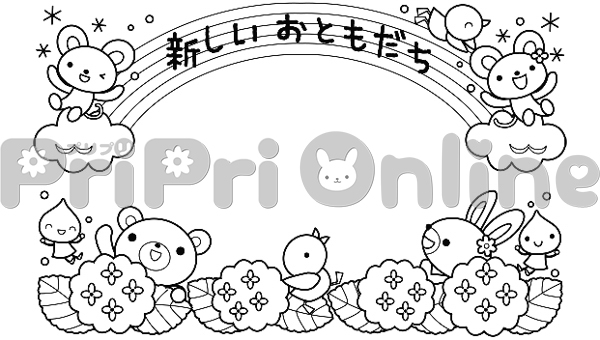 虹やアジサイで遊ぶ動物たちと「新しいおともだち」の飾り枠(白黒)