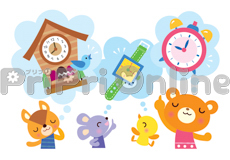 いろいろな時計を思い浮かべる動物たちのイラスト(白黒)