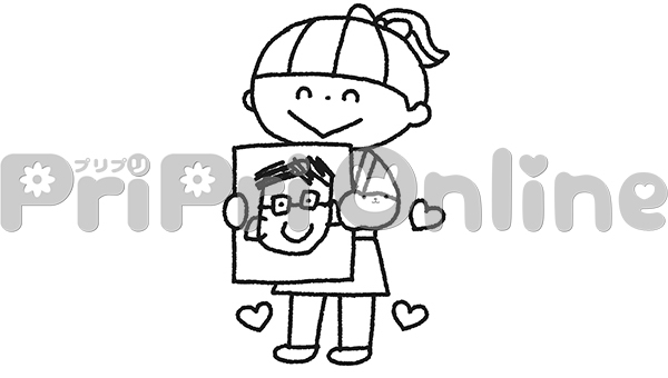 父の日の似顔絵を手に持つ女の子のイラスト(白黒)